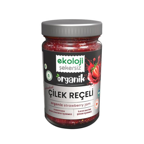Organik Şekersiz Çilek Reçeli 380 gr; doğal ve katkısız, sağlıklı ve lezzetli, kahvaltılar ve tatlılar için ideal bir reçel seçeneği!